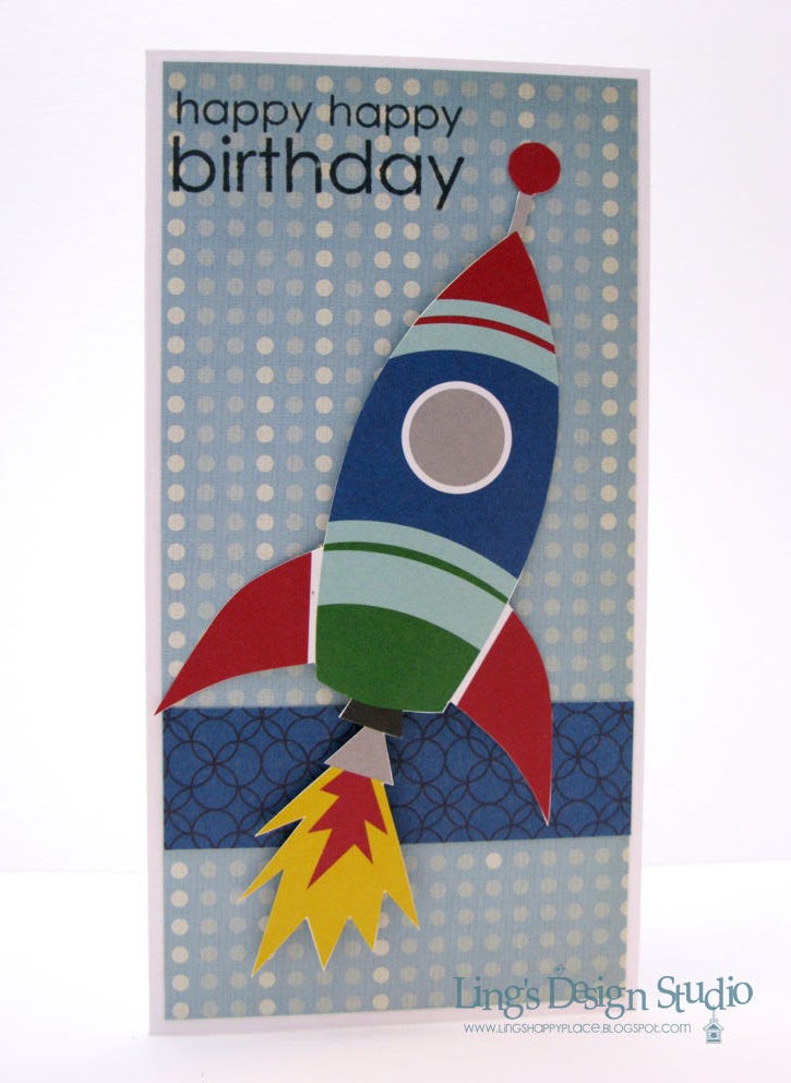Only after I gave the card away, that I realized that something is missing from this card. I wish I had added something to the circle window on the rocket. Something that would make it cuter. Maybe a little boy's face or a critter peeking through the window? Well, it's too late now, but that's what missing from this card. :)